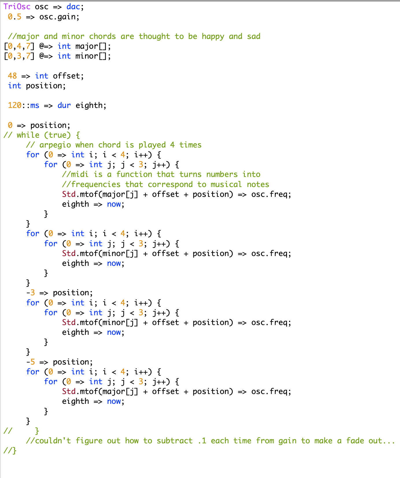 I found this guy on YouTube to learn some music theory at the same time as getting comfortable coding in ChucK. This video gave a basic intro to Major and Minor Chords, an Arpeggio or the repetition of 4 chords, and the Midi Function which turns numbers into the specific frequencies of musical notes.