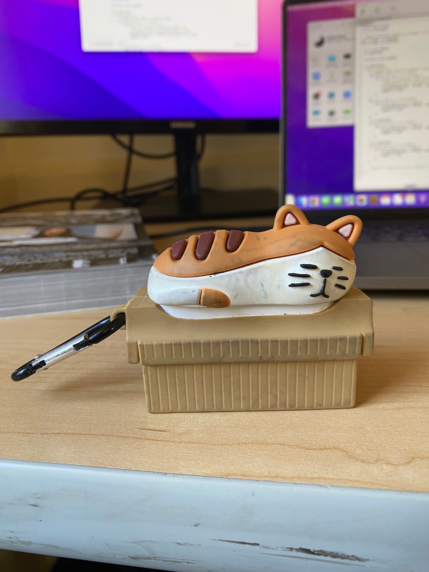 I bought an AirPod Pro case with the function to protect my expensive earbuds. I bought this one in particular because I felt like the form greatly aesthetically transcended the function. The AirPods case, normally rounded and a distinctive shape was totally transformed into a small figurine of a cat on a cardboard box, largely unrecognizable from the popular ear pods. Only the cat’s shape is reminiscent of the underlying top of the case it covers. A large brown box turns the rounded bottom into something that easily stands on your desk. The sleeping kitten perched atop this common brown box evokes calm emotions. The box surrounding the Botton of the AirPods case is about a quarter of an inch, which is much thicker than most silica cases I’ve seen, adding a solid weight and maximalism. The object’s simple, cartoonish form and concept is rather minimalist on the other hand. Most people wouldn’t think to intentionally decorate their items with a plastic “cardboard-esque” brown box, and this too adds to the mystic of this AirPods case. “Form expresses function” typically, but I’d say this design takes the user away from looking at an airpod case, making the object’s function completely nonobvious, and gives them an intriguing cat object, one which I am asked about by strangers all the time.