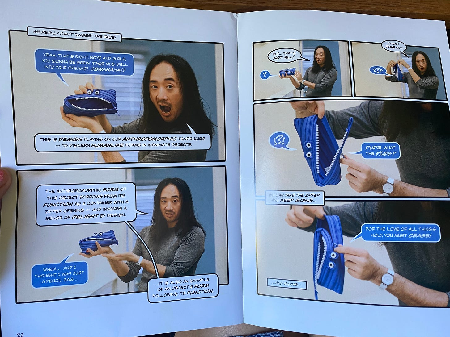 I loved the intro to design with the classic zipper pencil pouch - elevated to the realm of the sublime! My friends and I all had these pencil pouches in middle school but I’ve never since reflected on why we found them so interesting. It’s fun to play with unzipping them all the way, and the face is anthropomorphic which makes it more interesting to people. From a young age babies identify facelike shapes -_- over other shapes _-_ and face-like things stimulate our fusiform face gyrus and giving us a way to emotionally connect to it. Most people in my school instinctively gave these pouches a name, likely because it had a face for us to emotionally connect with like we do people. But here the function of a zipper, giving an easy opening into the bag and a way of securing the contents inside of the bag, also becomes the form, what the entire bag is made of, so function and form are combined! This concept was so clever, witty, and mindblowing (the word I’d use for sublime). I also think this concept is simple, removing all of the traditional elements of a pencil pouch besides the zipper to create a bag with just a zipper. Principle 1.11 Design is constraints reminds me of a d-school method for coming up with new ideas. By placing or removing constraints you can brainstorm new ideas, which may have led to the pencil pouch in the first place- what if you only had a zipper to create a pencil pouch? Novel and witty ideas often come from having less at hand, and being creative with what you have, especially a constraint on time.
