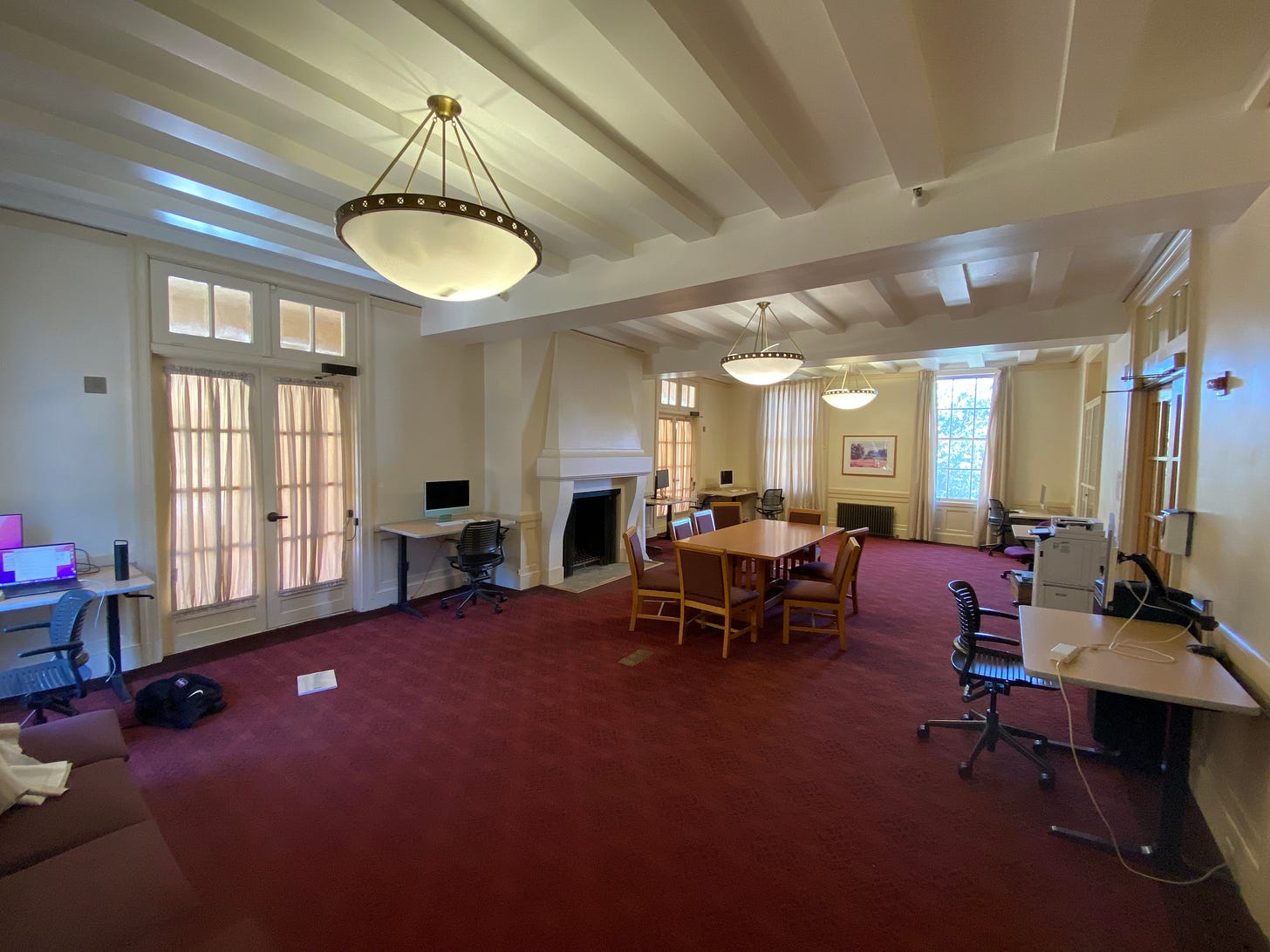 The room I am doing my assignment in, the computer cluster in Toyon, I noticed was designed to be very conducive for working either individually or with others. The tables on the outskirts of the room are maximally seperated and all contain computers/monitors likely intended for individual work with a person facing outwards. The center of the room features a table for group work, without the screens impeding interaction. Beyond these features, the space is left simple, with lots of open space to stretch or other creative uses.